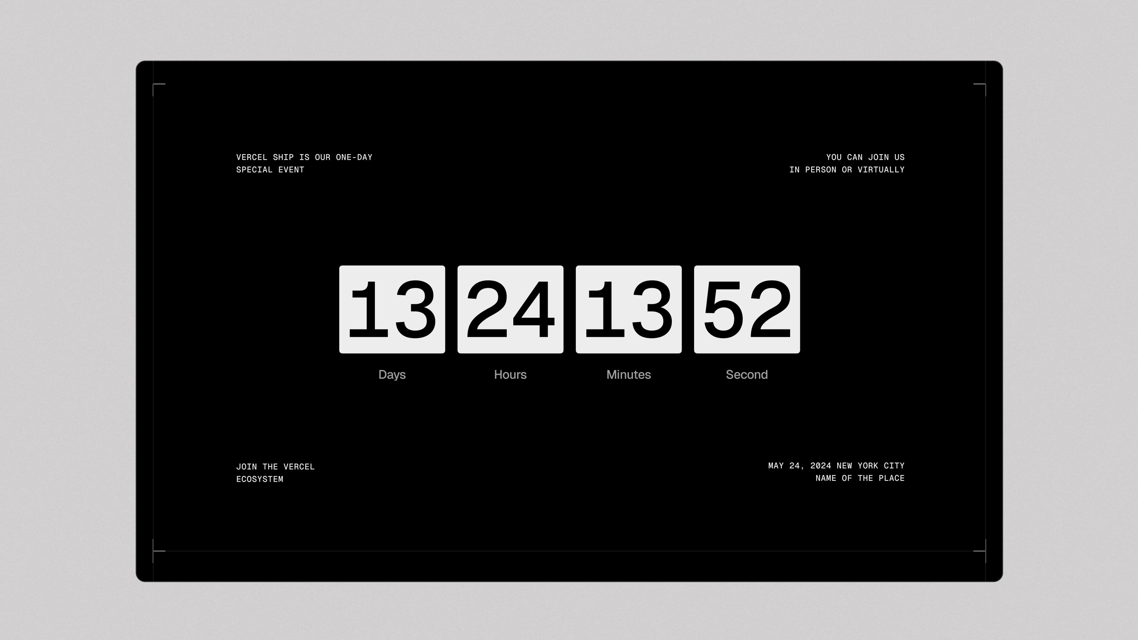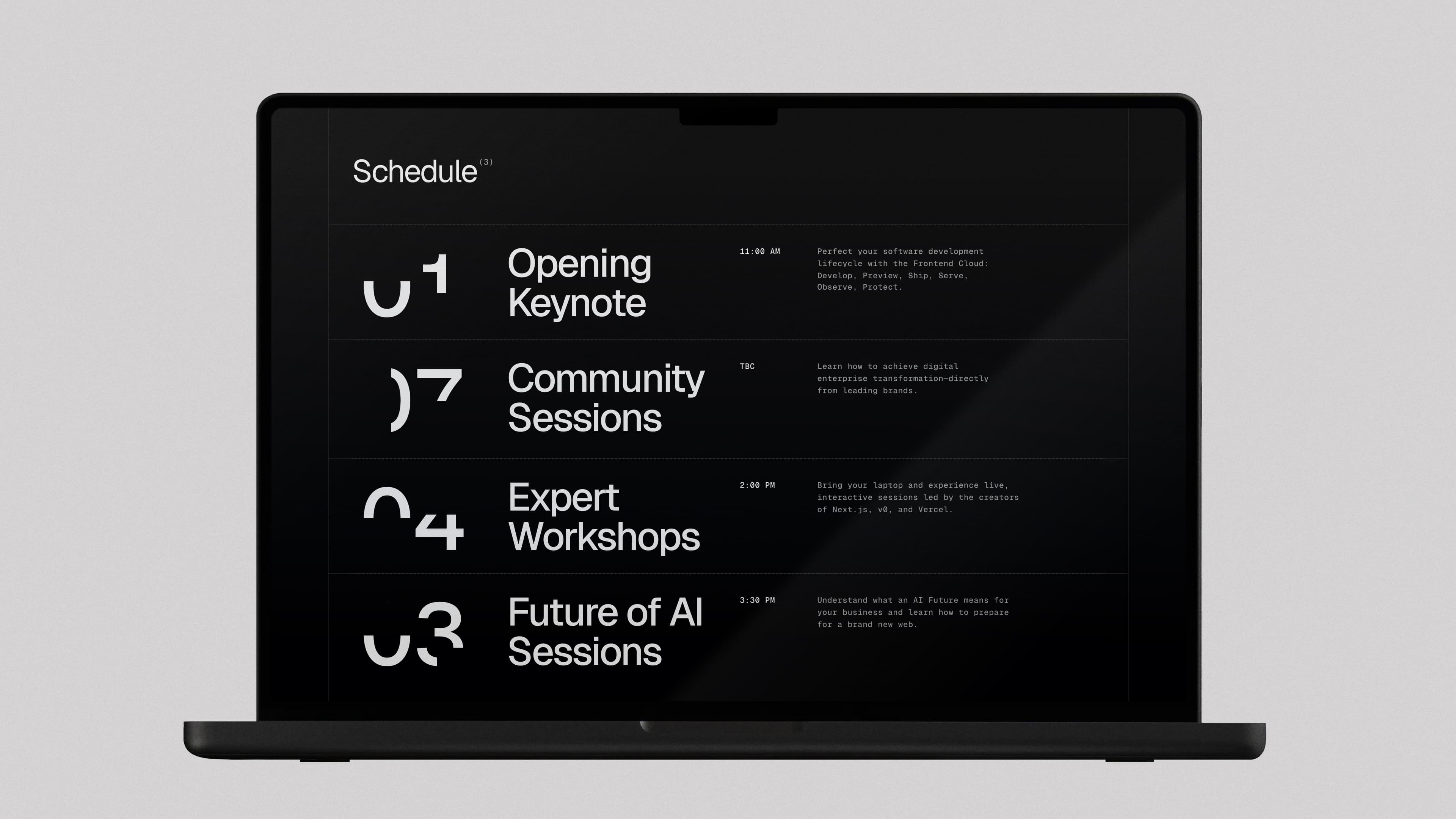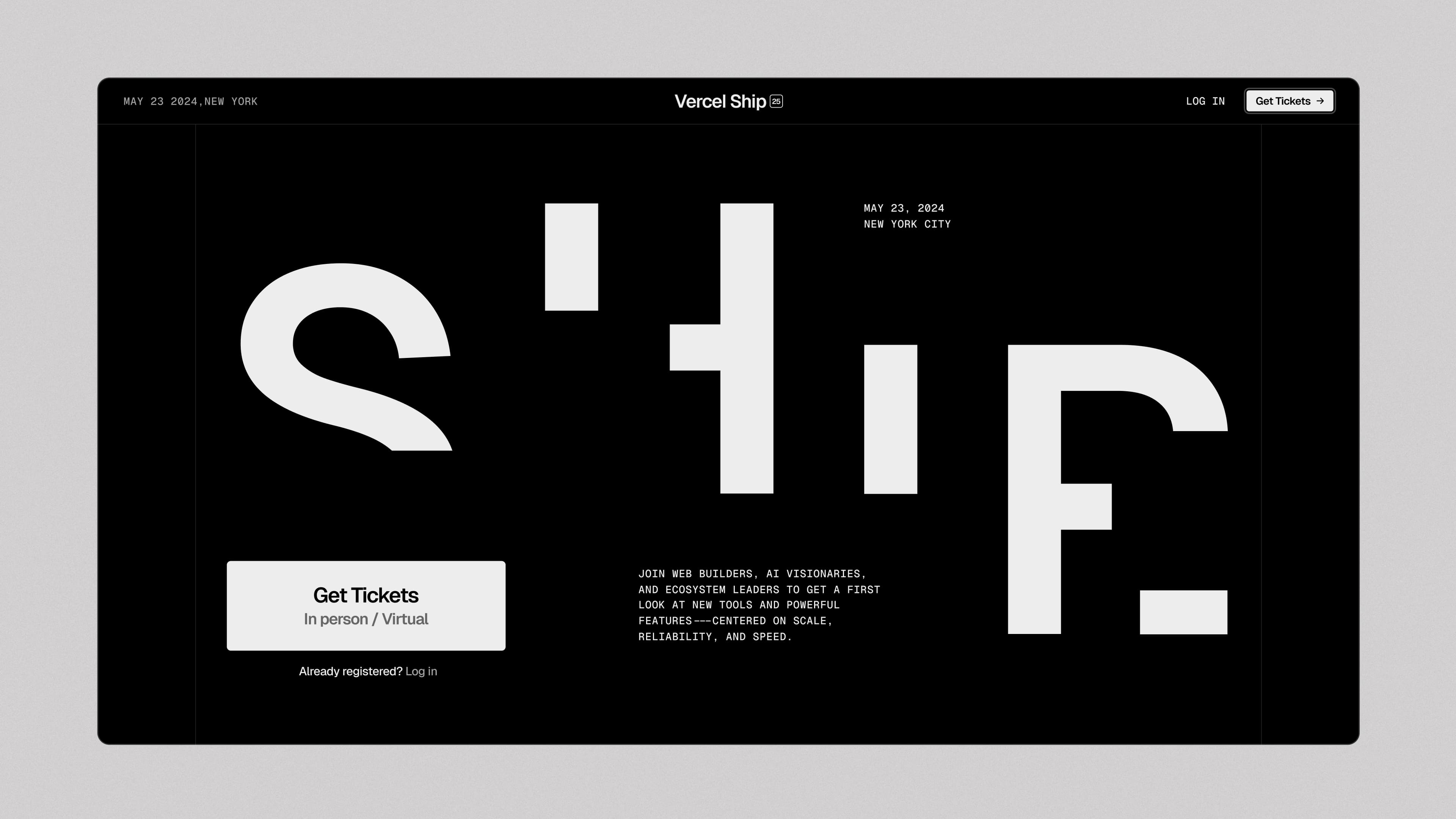 Teaming up with Vercel for the fourth time, we crafted a 360-degree experience that moved as fast as its audience. The website served as the entry point, streamlining subscriptions and setting the stage for what was to come. Beyond the screen, we collaborated on projection mapping, stage design, and creative direction to bring the event to life—supporting live demos, product reveals, and real-time engagement. From badges to posters and collaterals, every detail was designed to make Ship more than just an event—it was a fully immersive ecosystem.